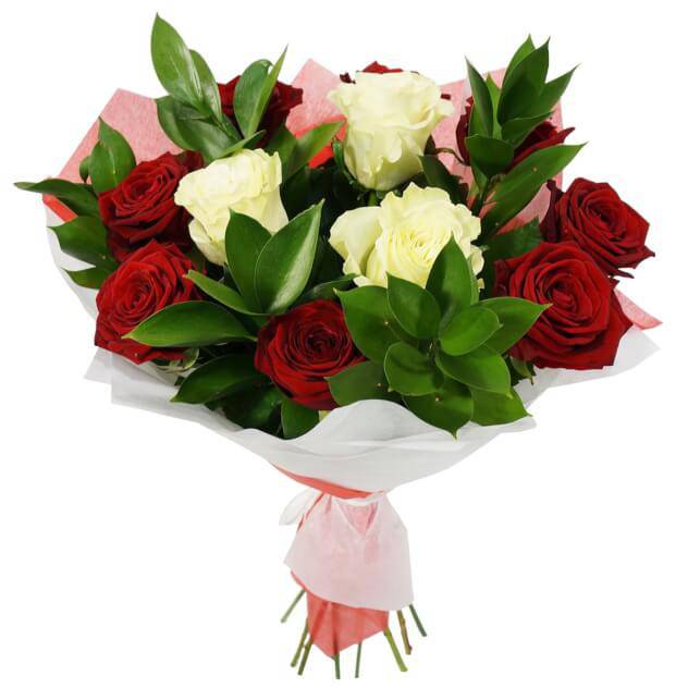Гармоничное сочетание двух, казалось бы, противоположностей в этом букете придает ему особенное изящество и шарм. Нежные и трогательные белые розы уравновешивают своих страстных красных сестер. Всю композицию выгодно подчеркивает декорирование из зелени, которое является выгодным фоном для цветов. Букет одаривает своей положительной энергией и теплотой.