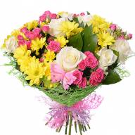 Яркий, оригинальный букет, впечатляющий буйством красок и оттенков. Сочетает скромность и нежность хризантем с немного дерзкой красотой роз. В то же время символичное значение розовой и белой розы только усиливает и подчеркивает присутствие хризантем, ведь розы здесь означают скромность, искренность и надежду на счастье. Такой вихрь легко станет украшением семейного праздника, подарит улыбку на лице любимой девушки или хорошей подруги.