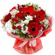 Хотя многие считают, что в зимних букетах преобладает снежно-белая цветовая гамма, на самом деле они балуют контрастами, неординарными сочетаниями и стойкими композициями, способными сохранить роскошный внешний вид и приятный аромат на долгие недели и даже месяцы. К таким шедеврам флористики относится и букет под названием «Зимний». На нежном белом фоне из утонченных астромерий и хризантем, изящно раскрывается бардовая роскошь пышных бутонов роз и благородные цветки гербер. Композиция символизирует женскую красоту, утонченность и элегантность, поэтому особенно придется по душе прекрасным дамам.